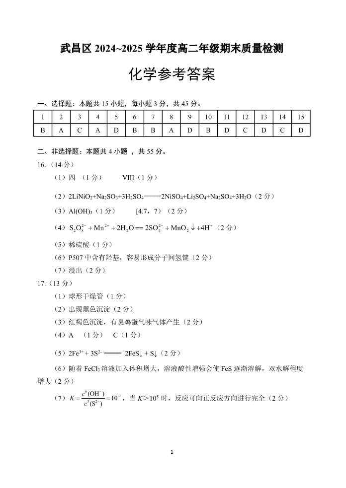 湖北省武昌区2024-2025学年下学期高二期末质量检测化学答案