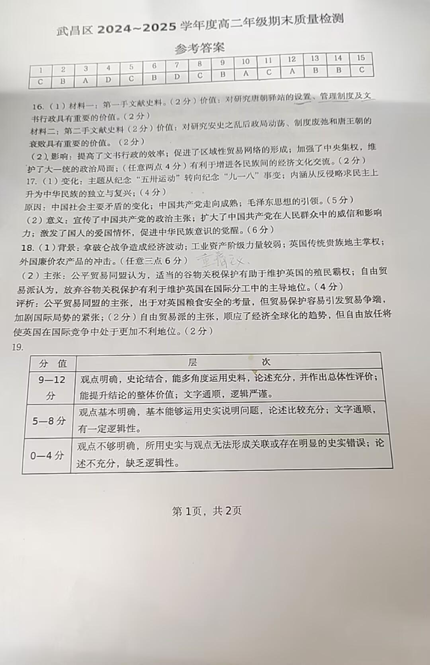 湖北省武昌区2024-2025学年下学期高二期末质量检测历史答案