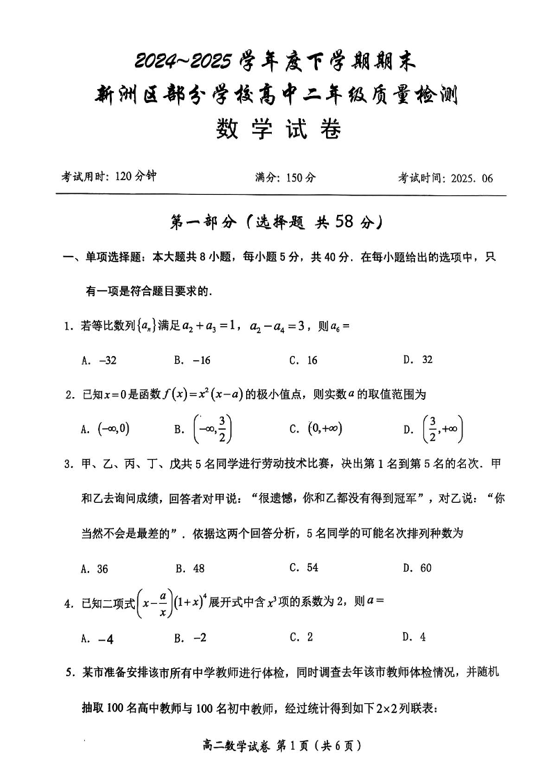 湖北省武汉市部分高中2024-2025学年下学期6月高二期末考试数学