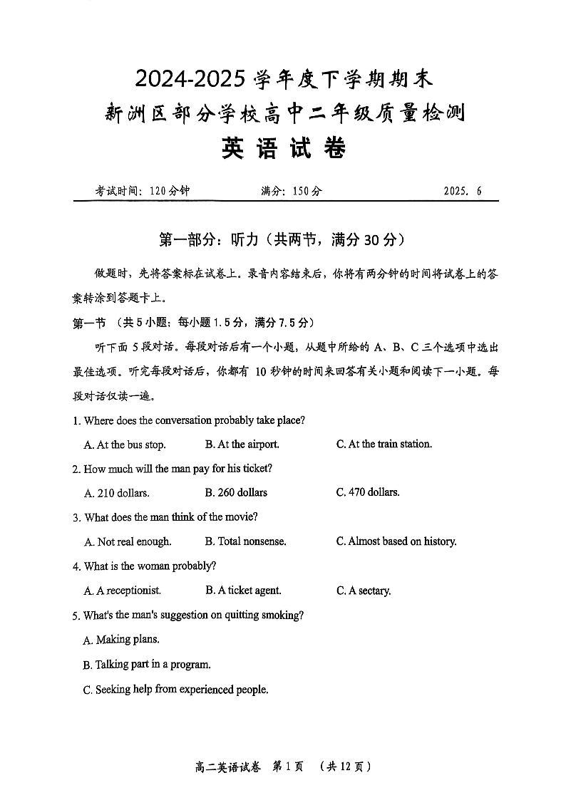 湖北省武汉市部分高中2024-2025学年下学期6月高二期末考试英语+答案