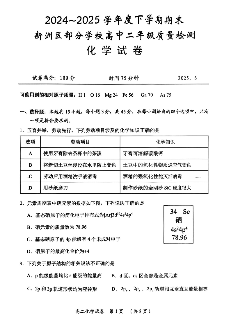 湖北省武汉市部分高中2024-2025学年下学期6月高二期末考试化学