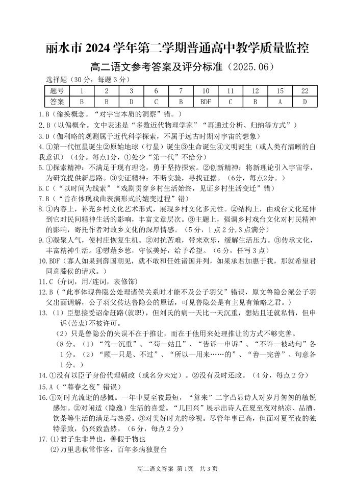 浙江省丽水市2024-2025学年下学期高二期末教学质量监控语文答案