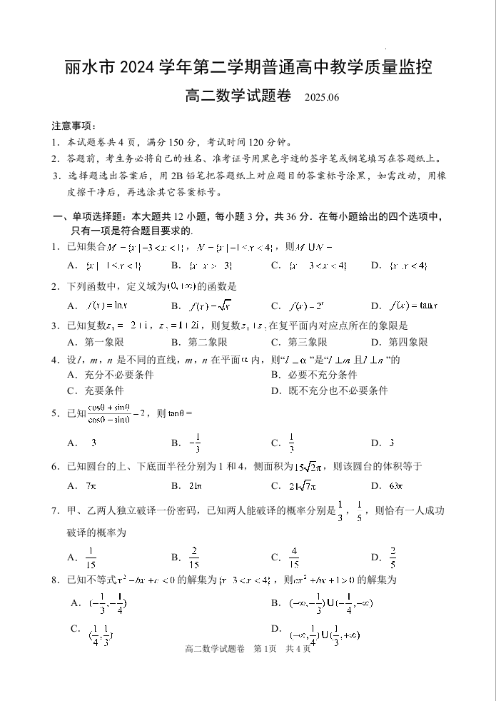 浙江省丽水市2024-2025学年下学期高二期末教学质量监控数学