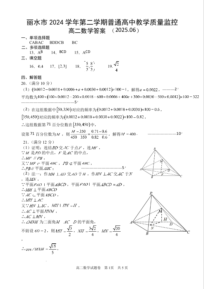 浙江省丽水市2024-2025学年下学期高二期末教学质量监控数学答案