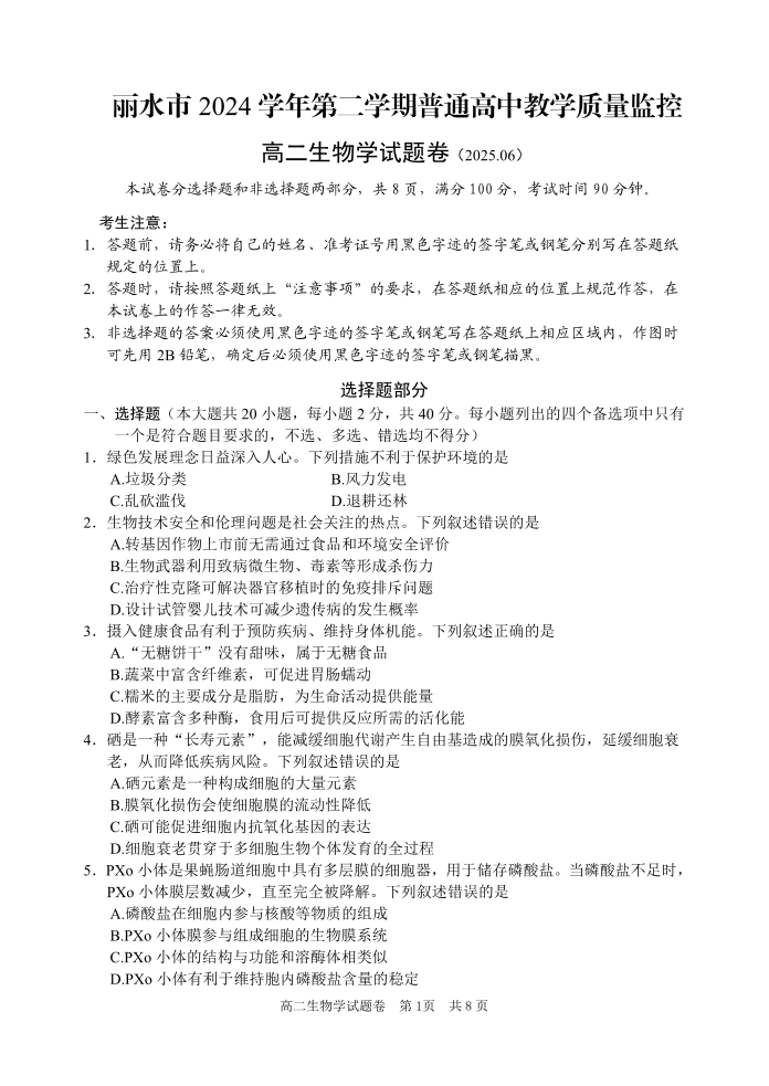 浙江省丽水市2024-2025学年下学期高二期末教学质量监控生物