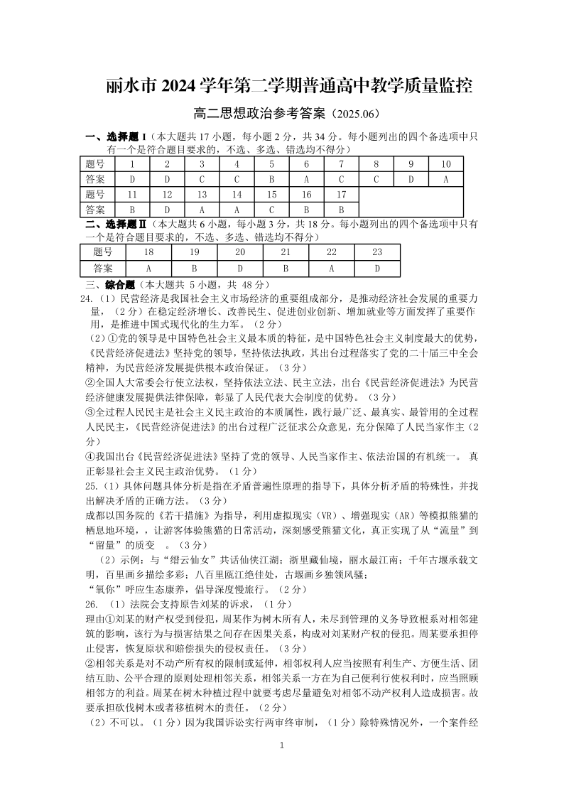 浙江省丽水市2024-2025学年下学期高二期末教学质量监控政治答案