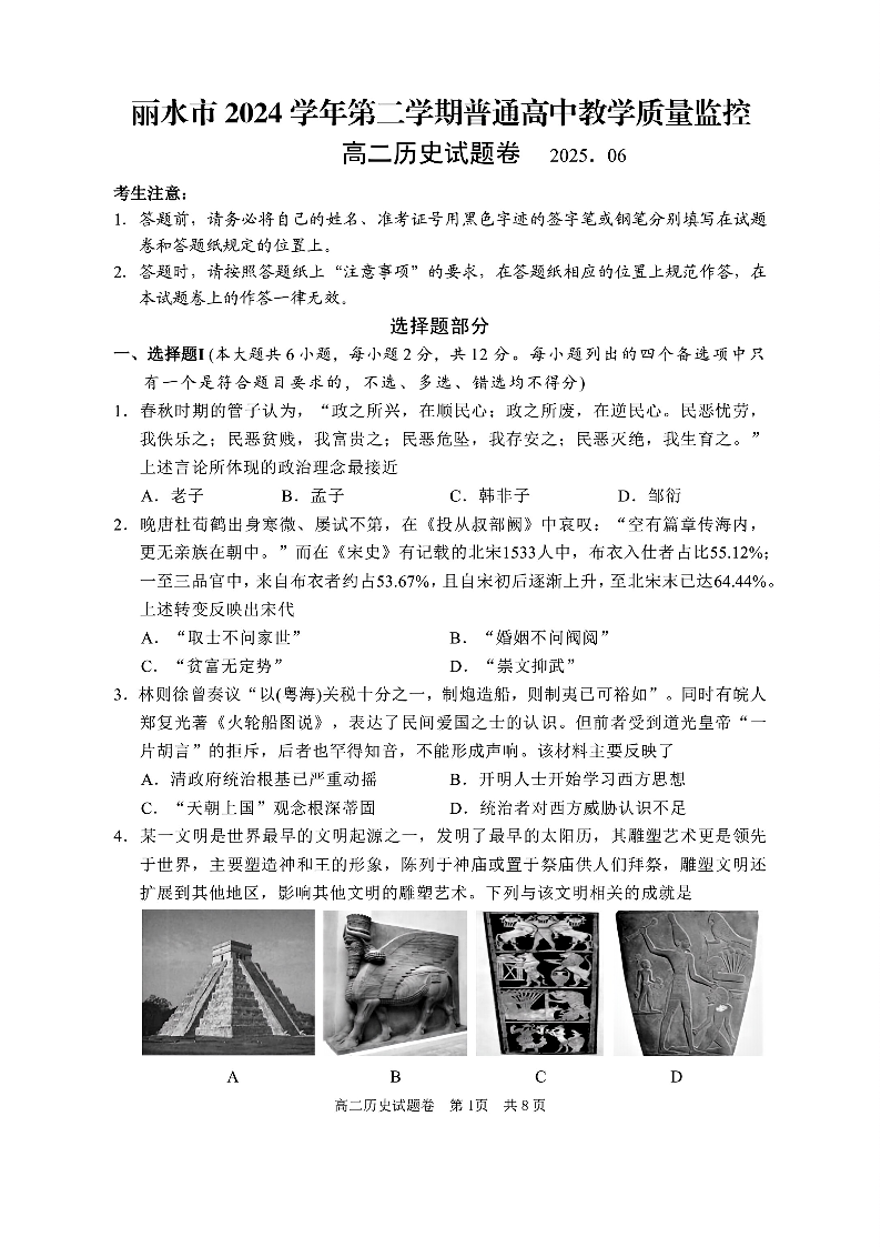 浙江省丽水市2024-2025学年下学期高二期末教学质量监控历史