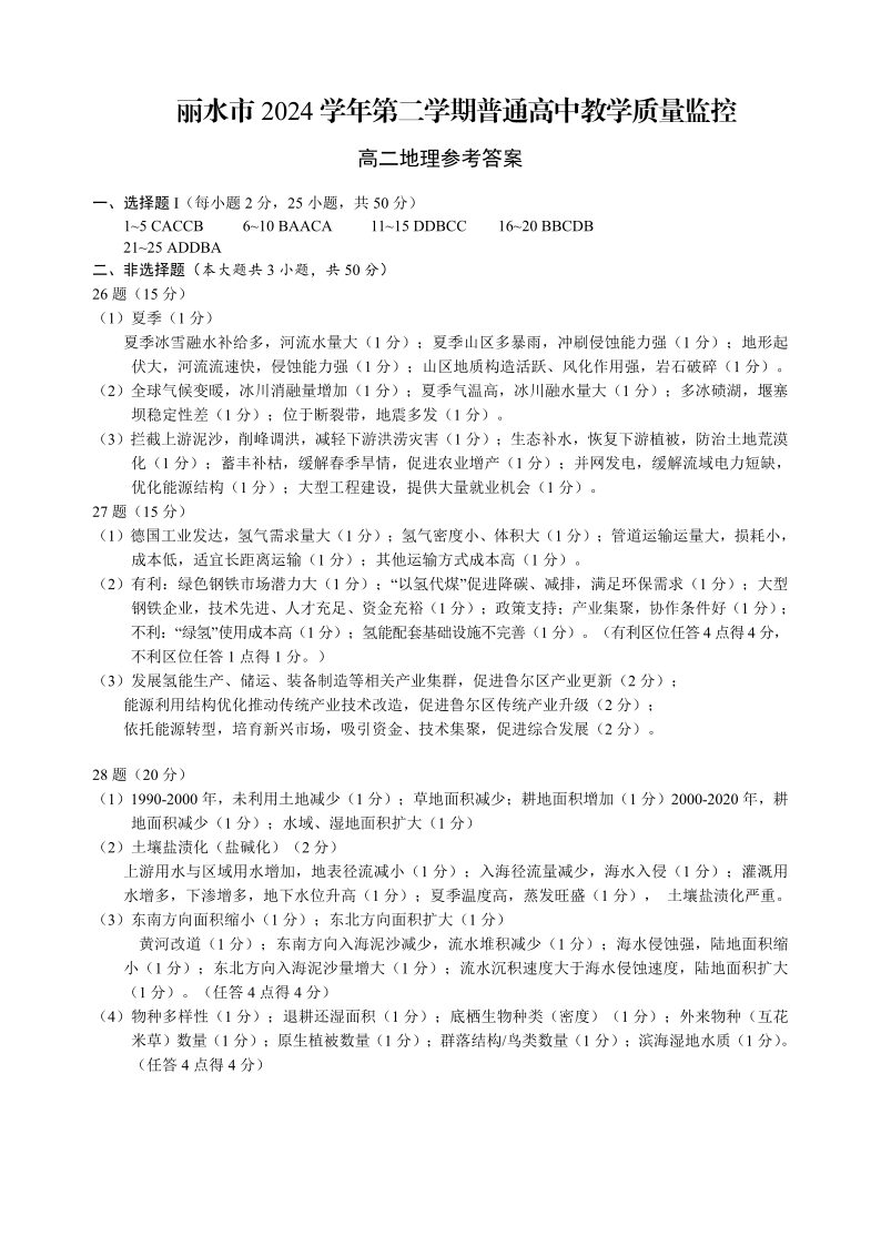浙江省丽水市2024-2025学年下学期高二期末教学质量监控地理答案