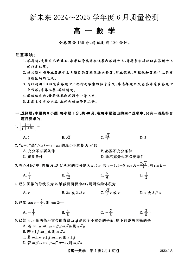 河南省新未来2024-2025学年高一下学期6月质量检测数学+答案