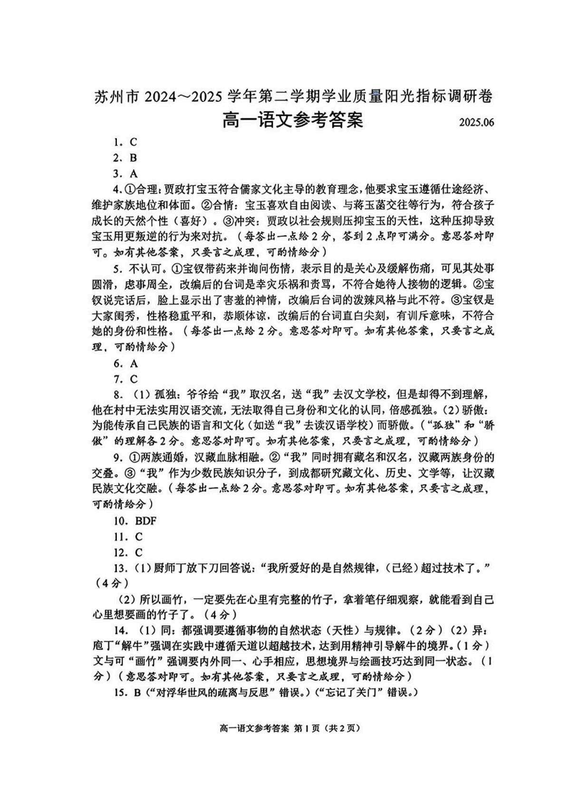 江苏省苏州市2024-2025学年高一下学期学业质量阳光指标调研语文答案
