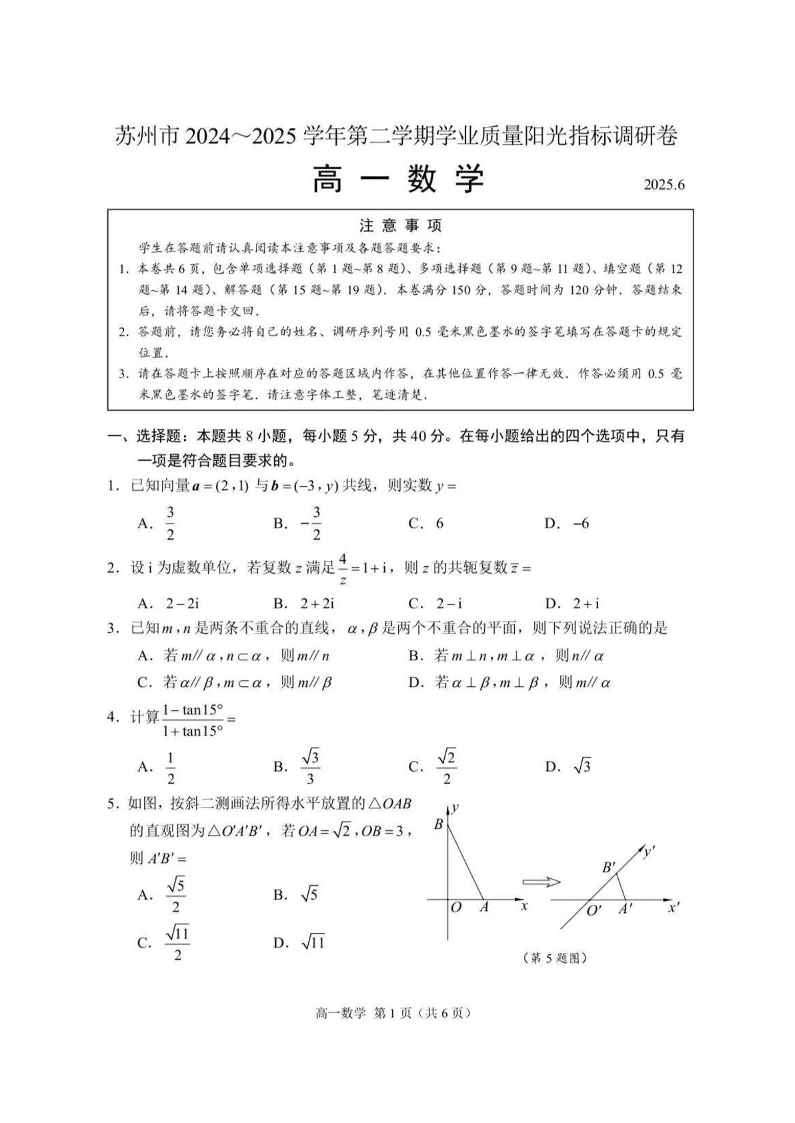 江苏省苏州市2024-2025学年高一下学期学业质量阳光指标调研数学