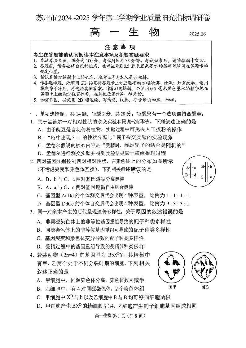 江苏省苏州市2024-2025学年高一下学期学业质量阳光指标调研生物