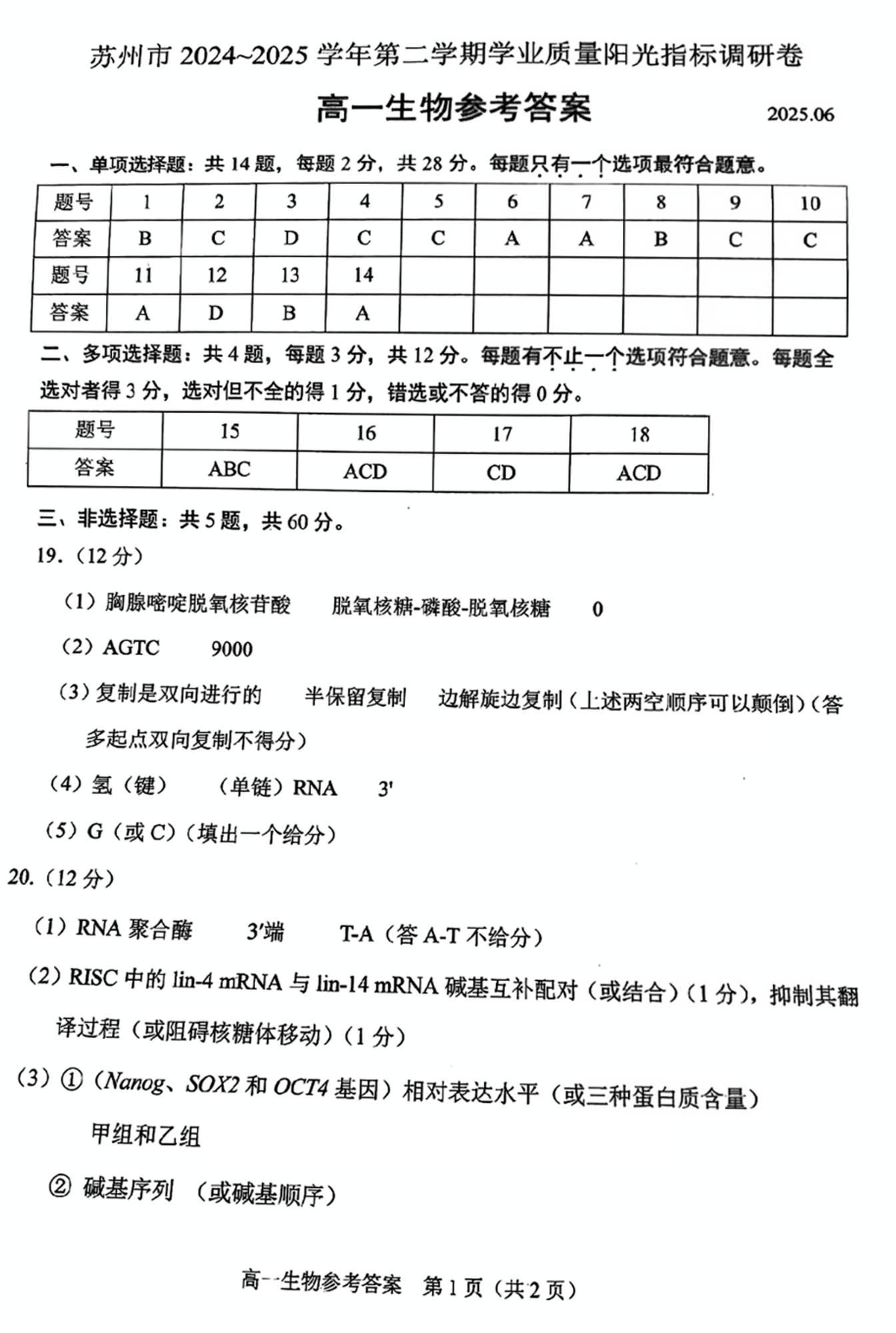 江苏省苏州市2024-2025学年高一下学期学业质量阳光指标调研生物答案