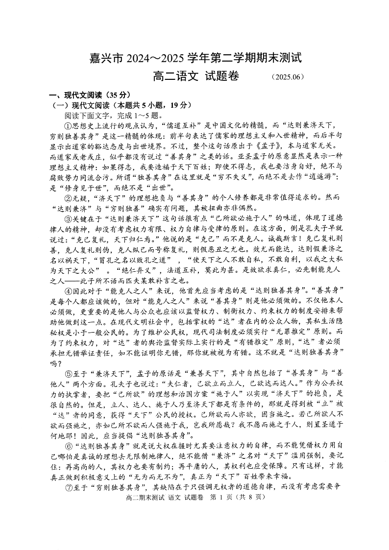 浙江省嘉兴市2024~2025学年第二学期高二期末检测语文