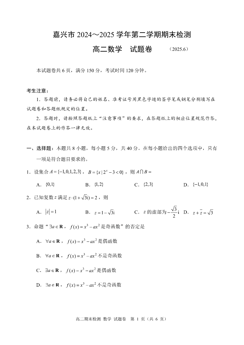 浙江省嘉兴市2024~2025学年第二学期高二期末检测数学