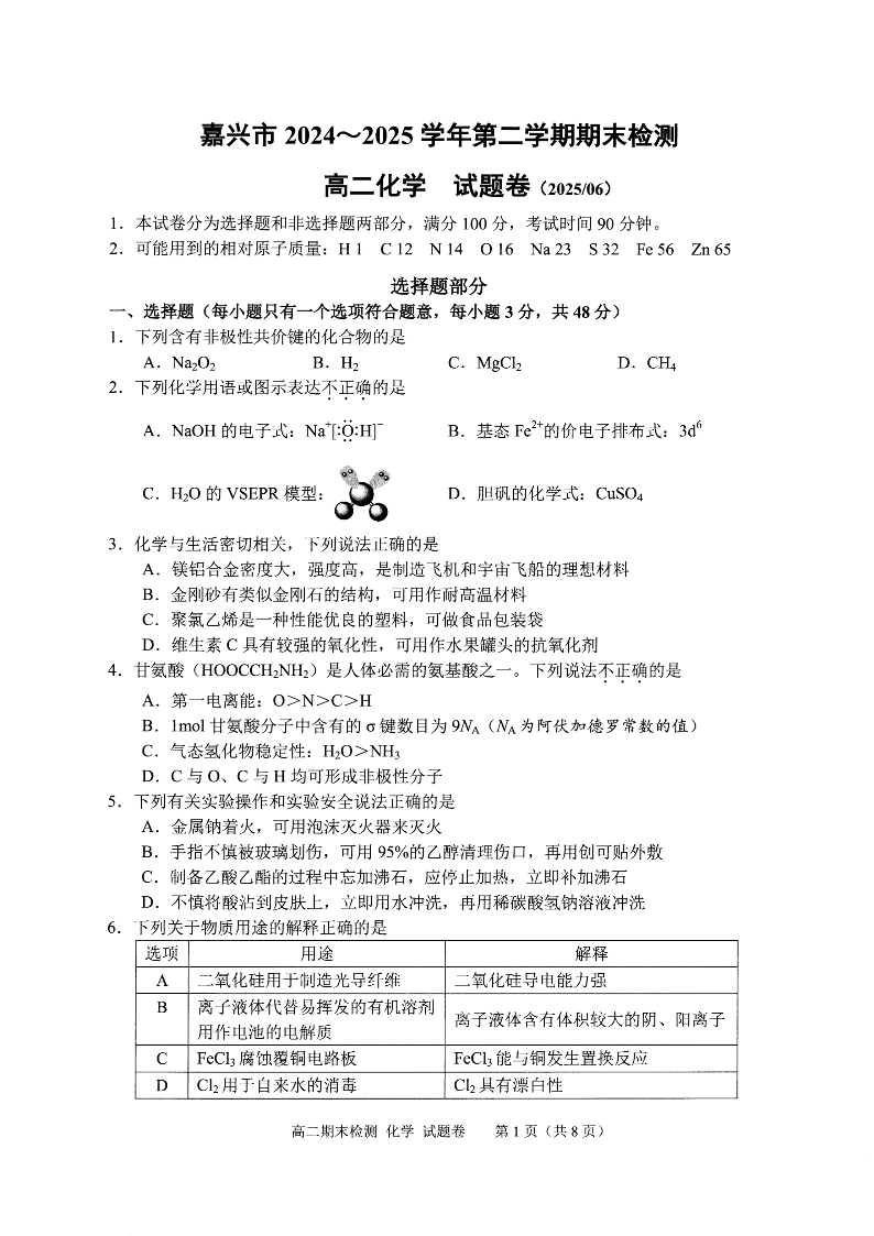 浙江省嘉兴市2024~2025学年第二学期高二期末检测化学