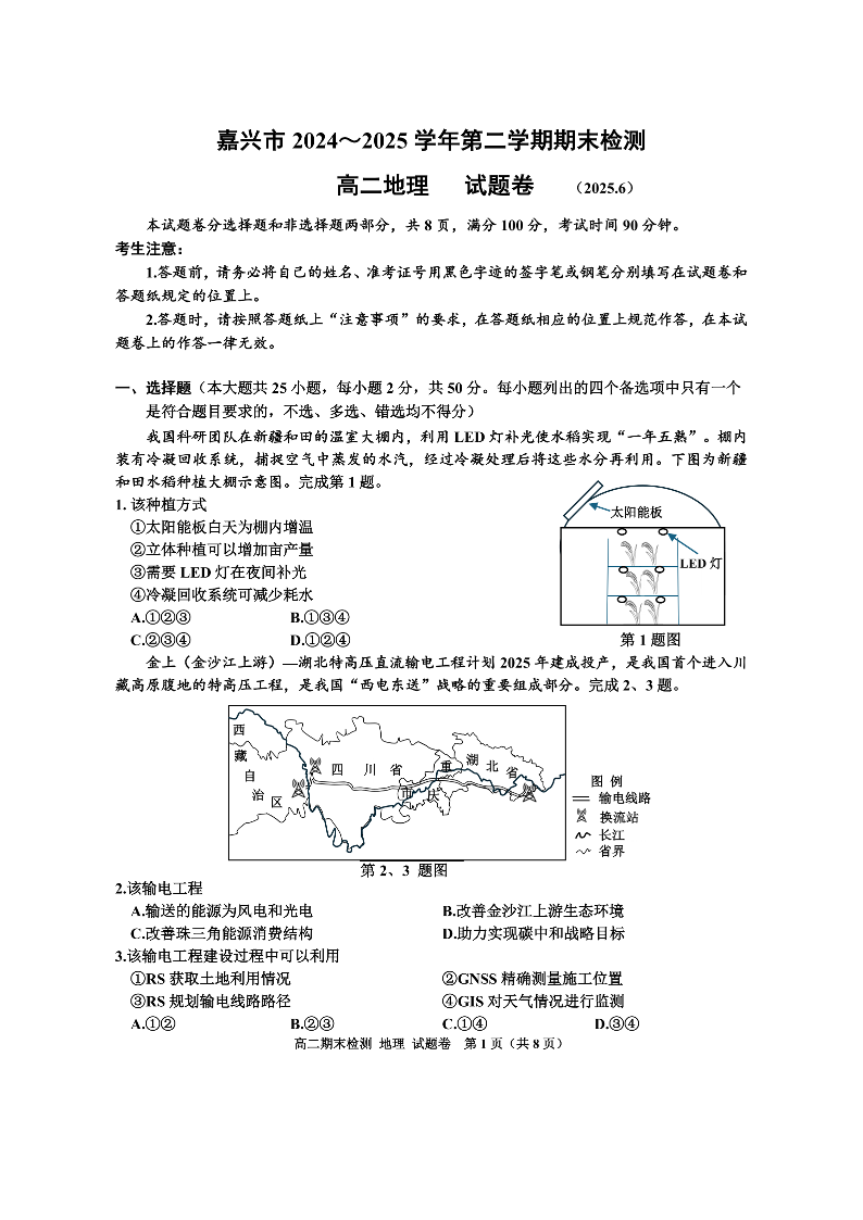 浙江省嘉兴市2024~2025学年第二学期高二期末检测地理