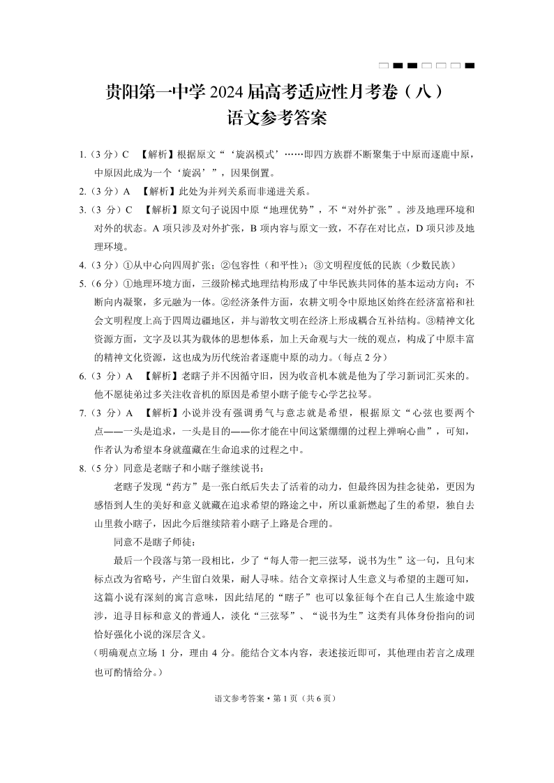 贵州省贵阳市第一中学2024届高三适应性月考(八)语文答案