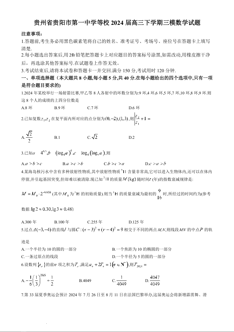 贵州省贵阳市第一中学2024届高三适应性月考(八)数学