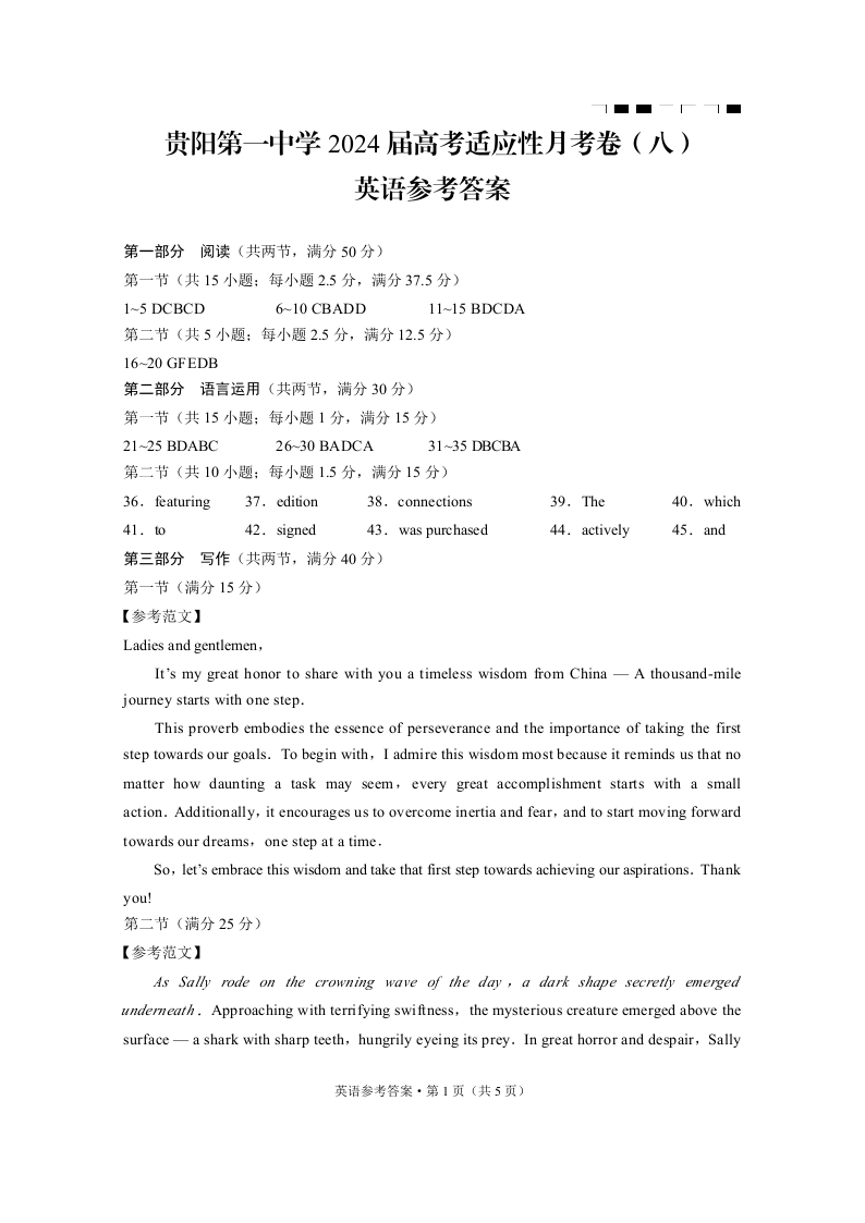 贵州省贵阳市第一中学2024届高三适应性月考(八)英语答案