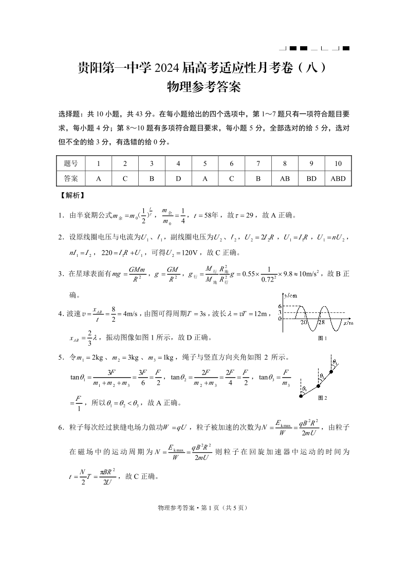 贵州省贵阳市第一中学2024届高三适应性月考(八)物理答案