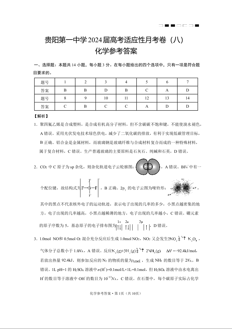贵州省贵阳市第一中学2024届高三适应性月考(八)化学答案