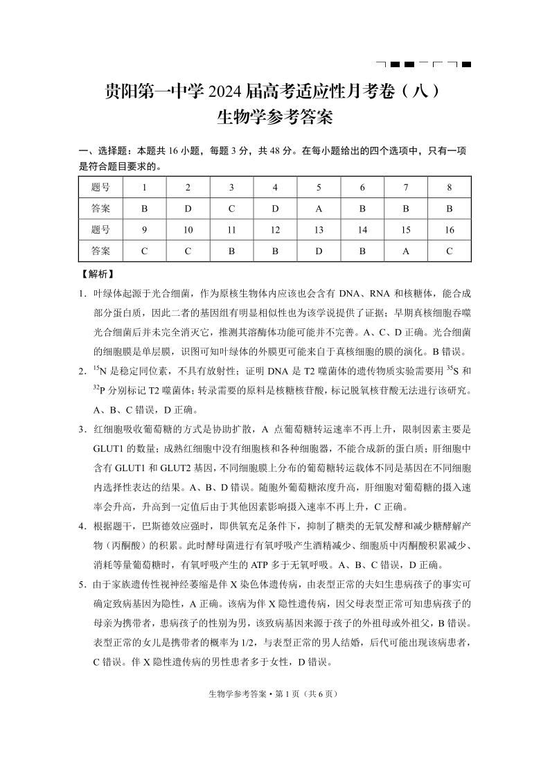 贵州省贵阳市第一中学2024届高三适应性月考(八)生物答案