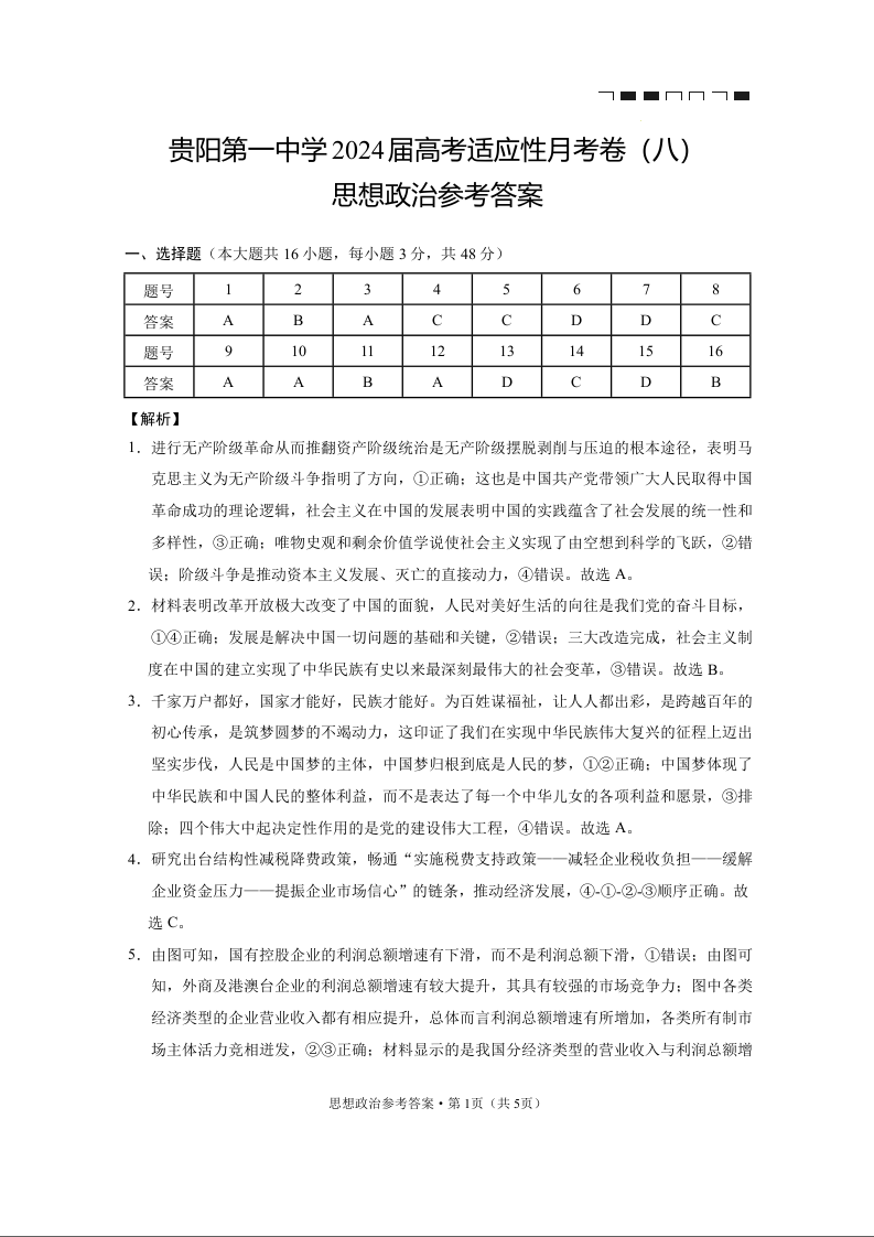 贵州省贵阳市第一中学2024届高三适应性月考(八)政治答案