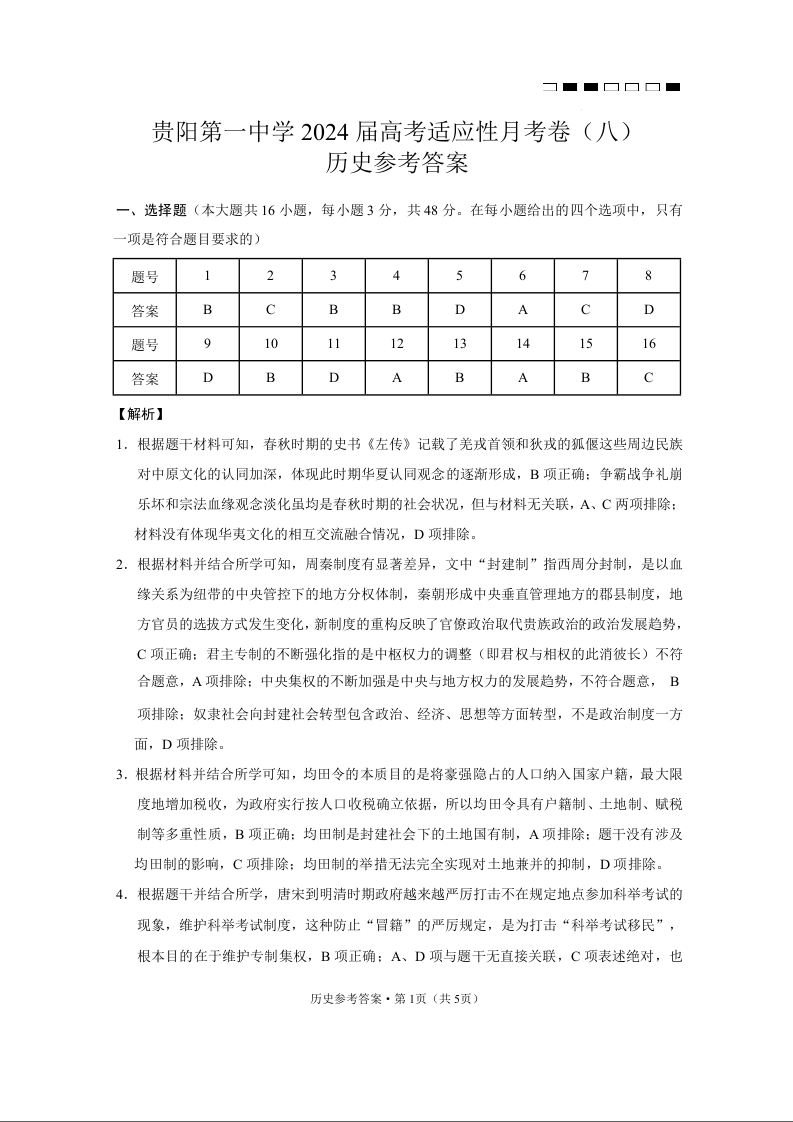 贵州省贵阳市第一中学2024届高三适应性月考(八)历史答案