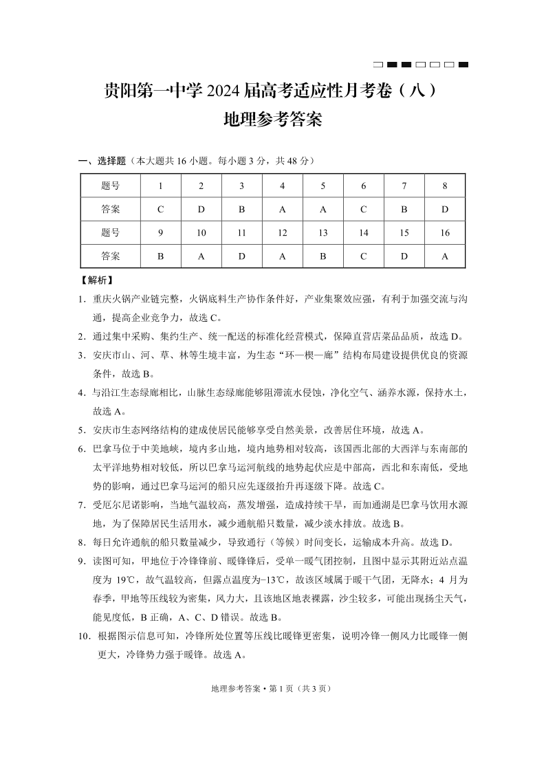 贵州省贵阳市第一中学2024届高三适应性月考(八)地理答案