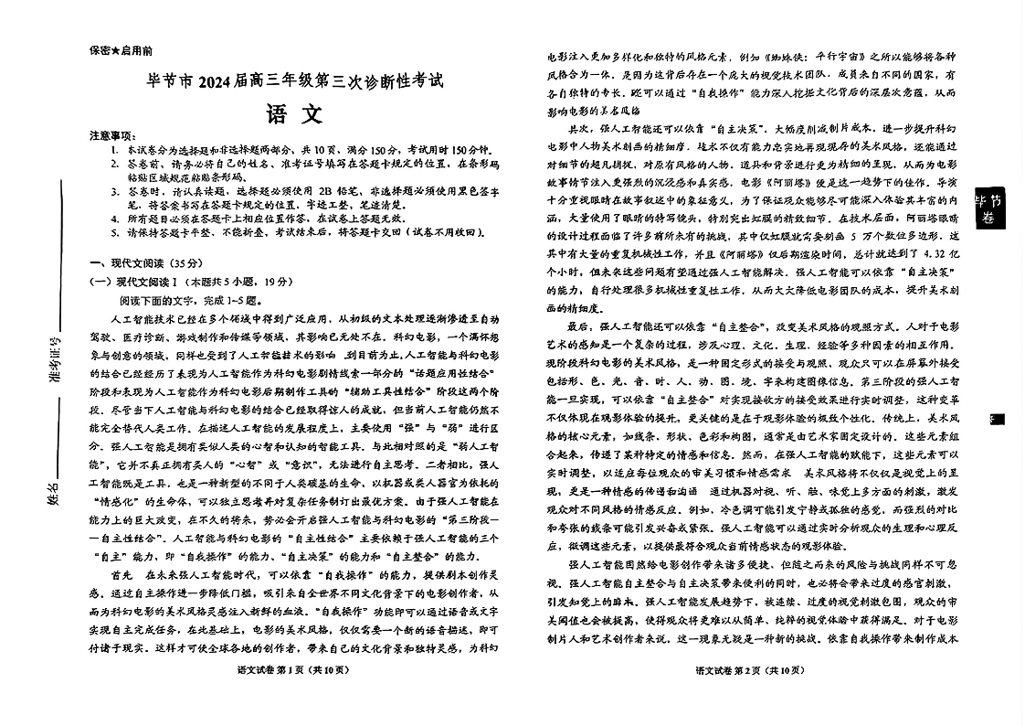 贵州省毕节市2024届高三第三次诊断性考试语文+答案