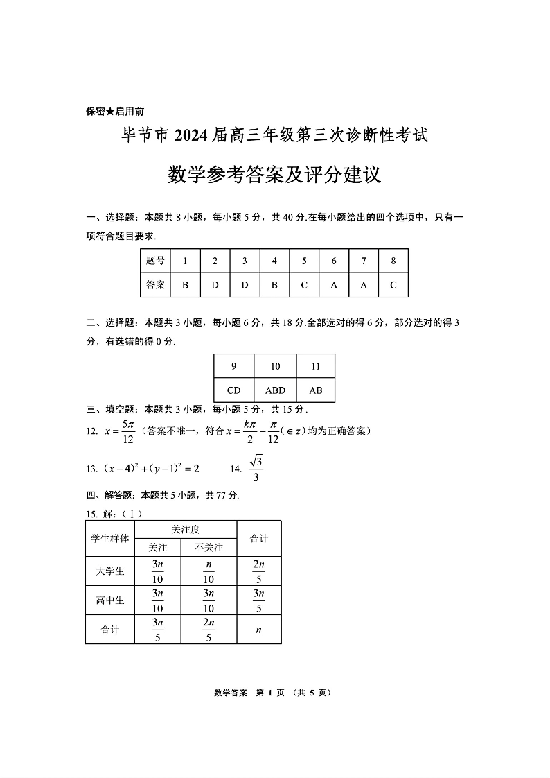 贵州省毕节市2024届高三第三次诊断性考试数学答案