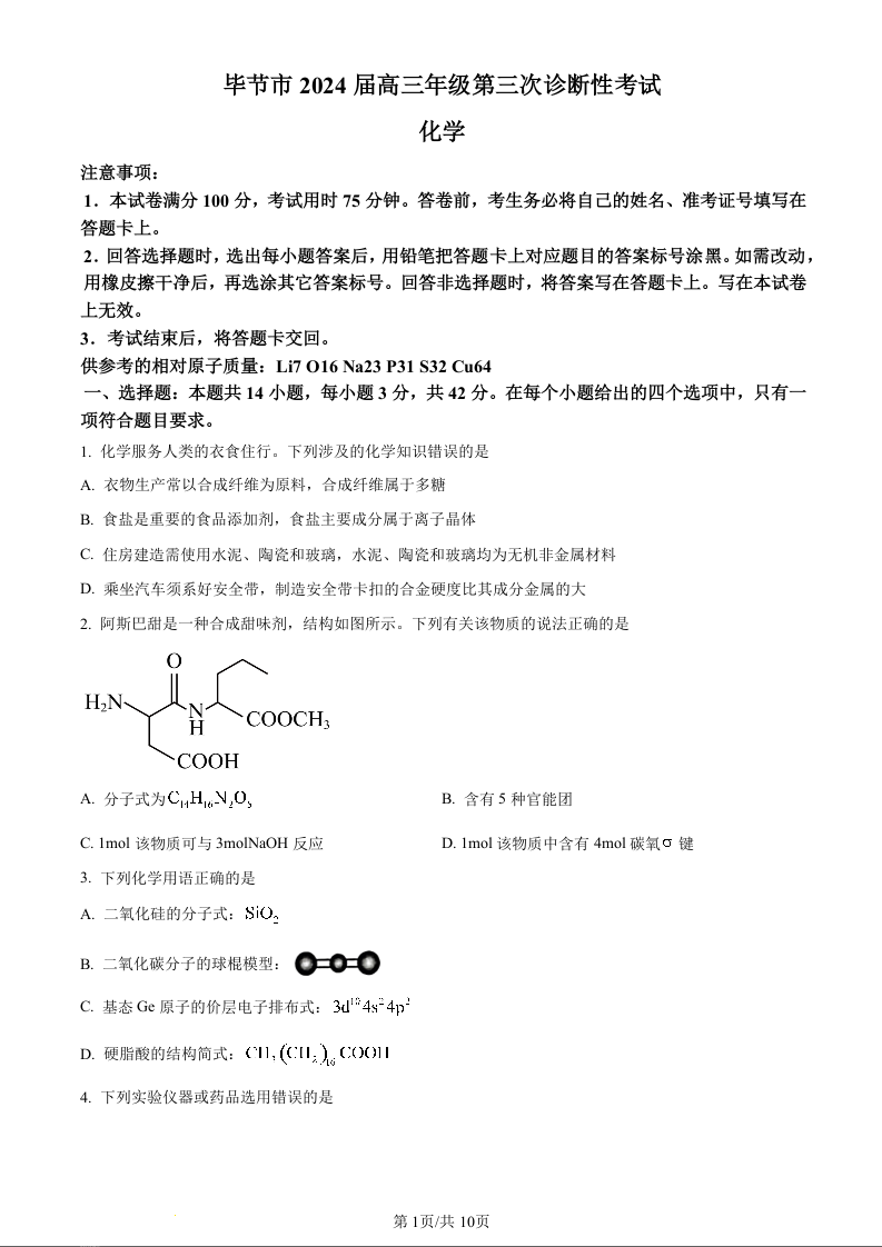 贵州省毕节市2024届高三第三次诊断性考试化学(原卷版)