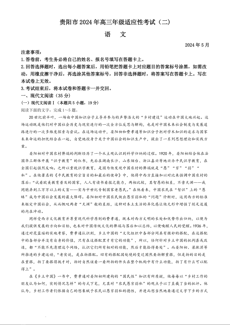 贵州省贵阳市2024届高三5月适应性考试(二)语文+答案