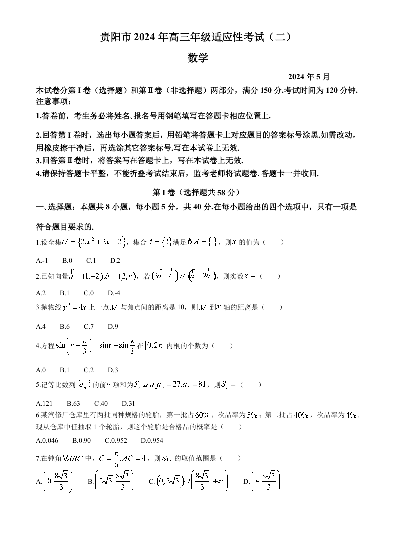贵州省贵阳市2024届高三5月适应性考试(二)数学