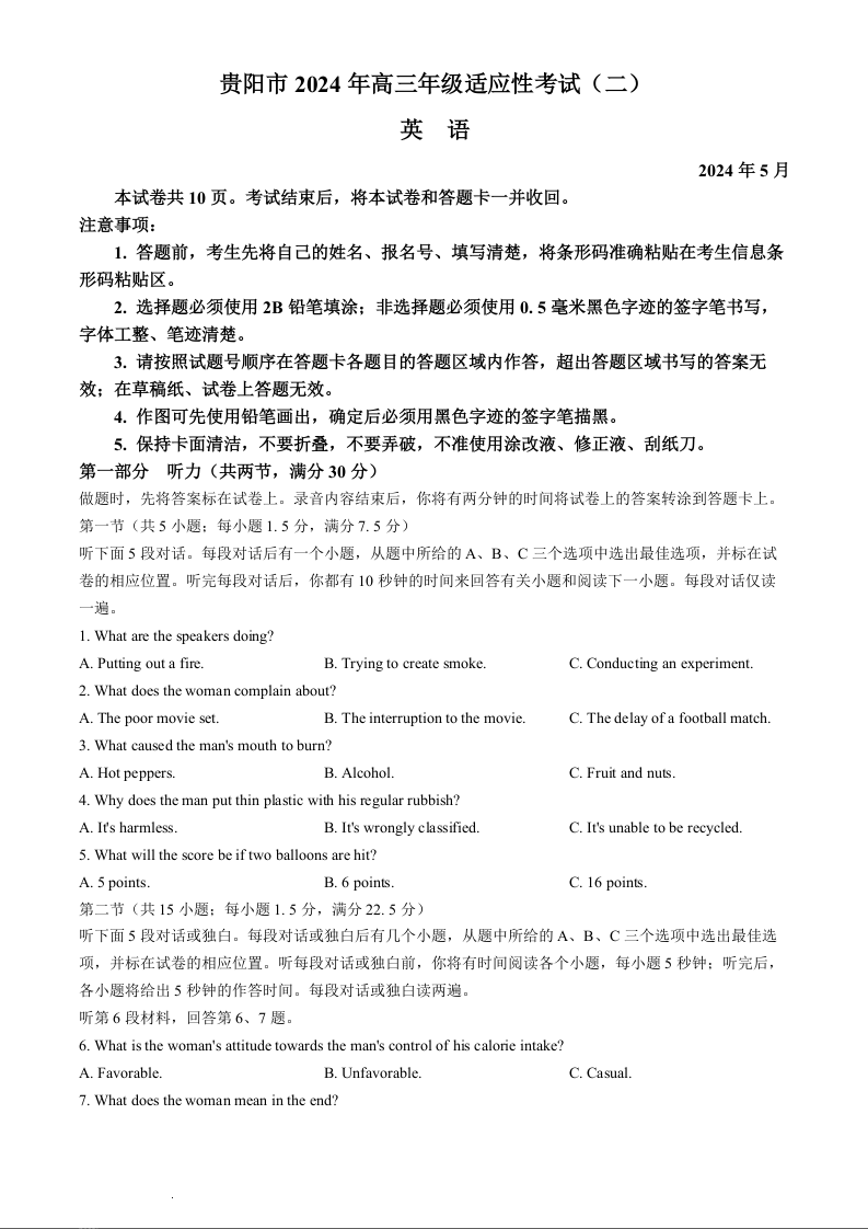 贵州省贵阳市2024届高三5月适应性考试(二)英语+答案