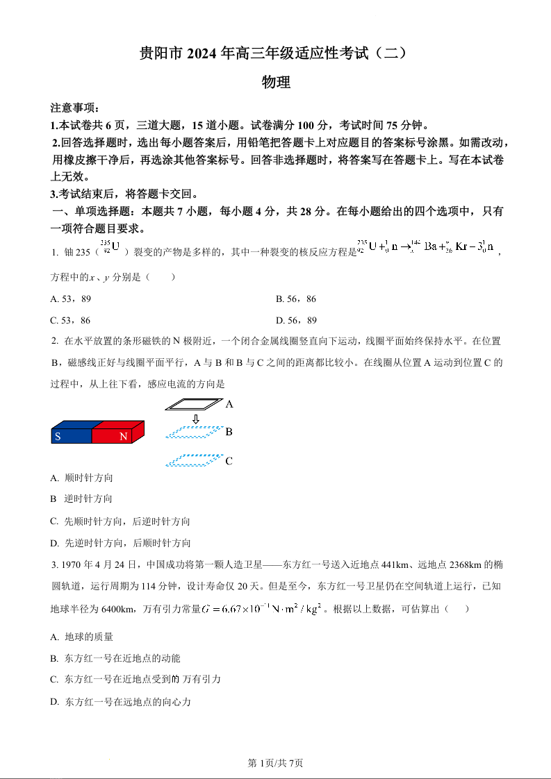 贵州省贵阳市2024届高三5月适应性考试(二)物理(原卷版)