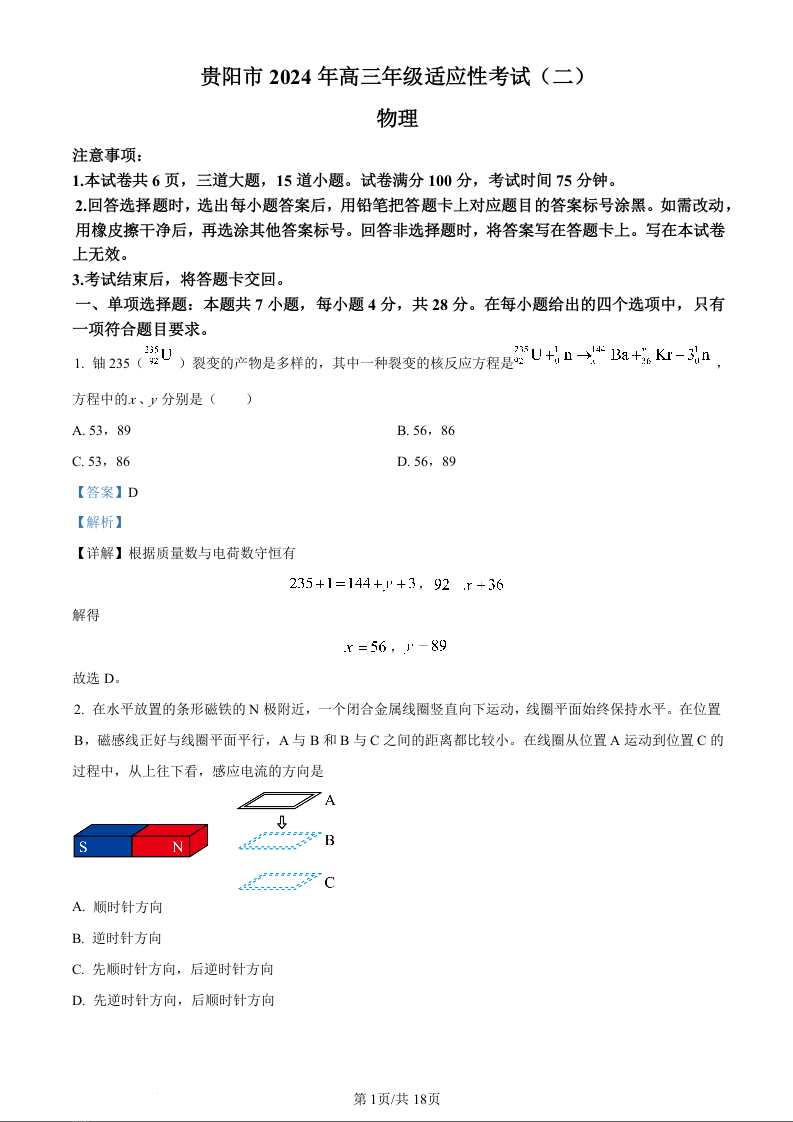 贵州省贵阳市2024届高三5月适应性考试(二)物理(精品解析版)