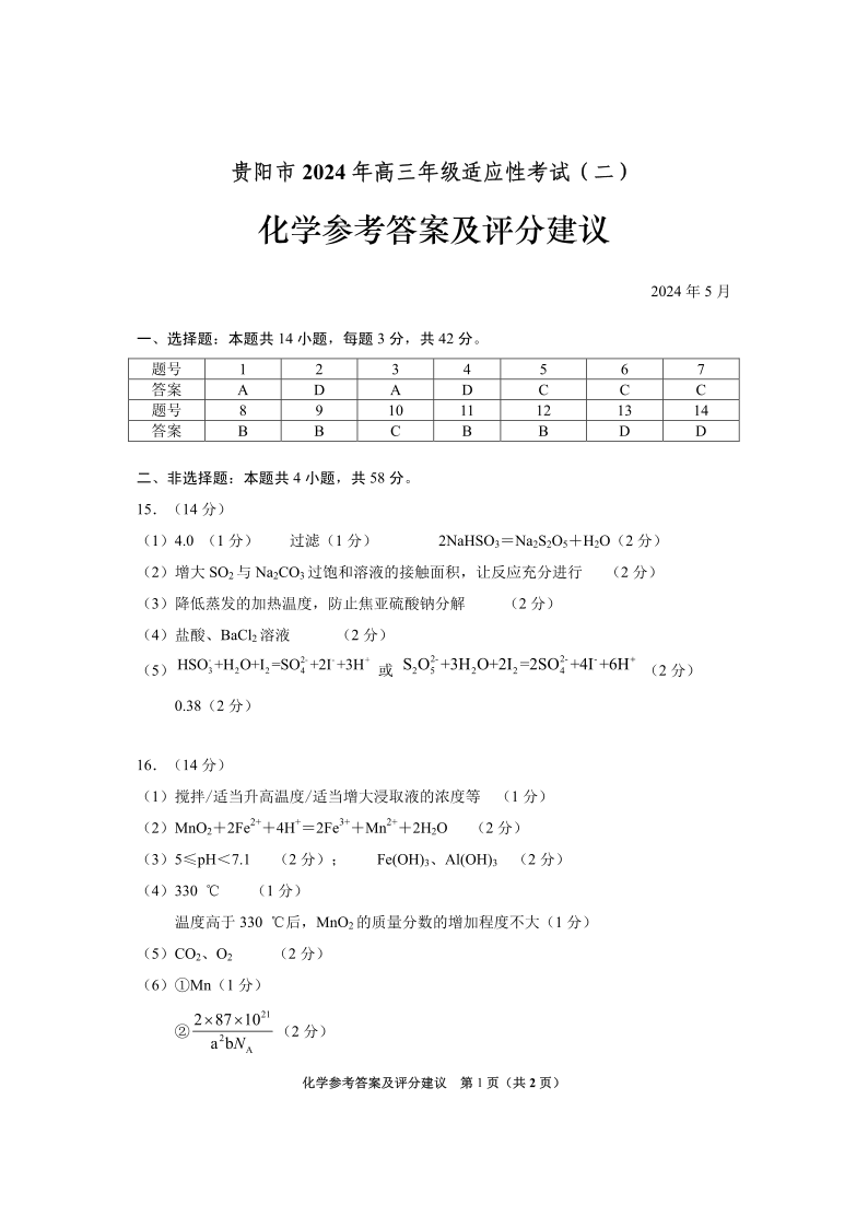贵州省贵阳市2024届高三5月适应性考试(二)化学答案