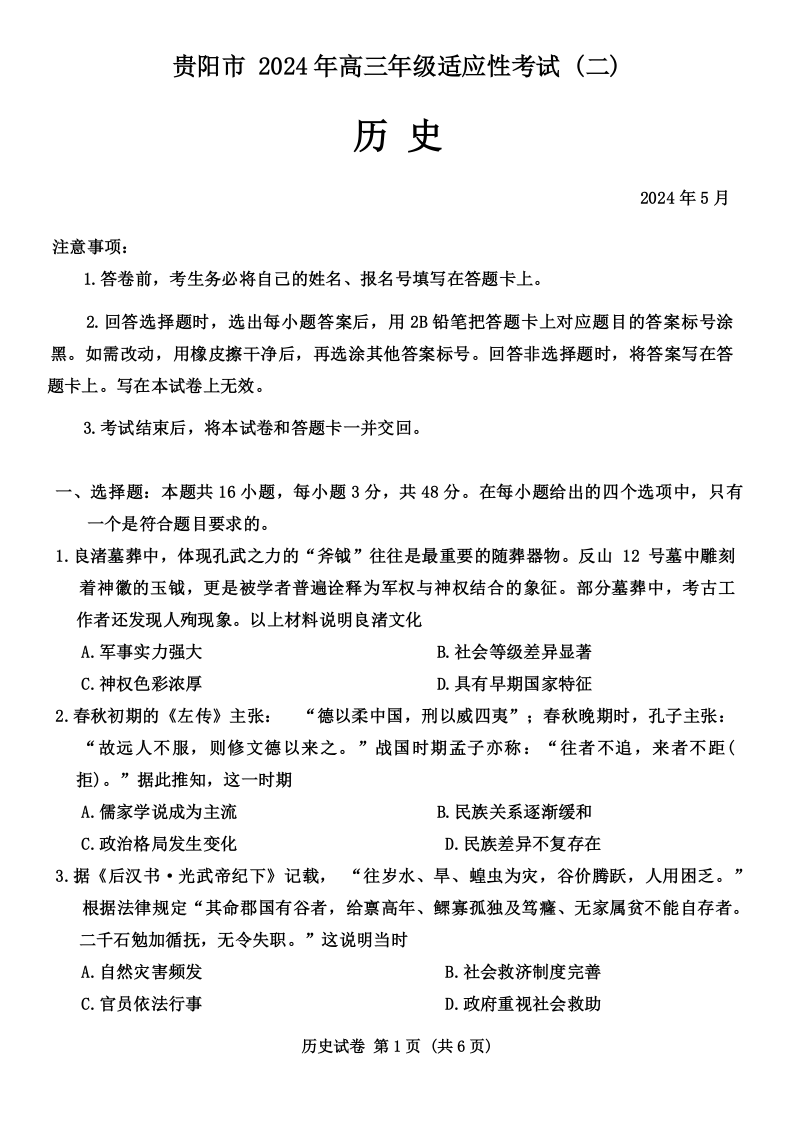贵州省贵阳市2024届高三5月适应性考试(二)历史