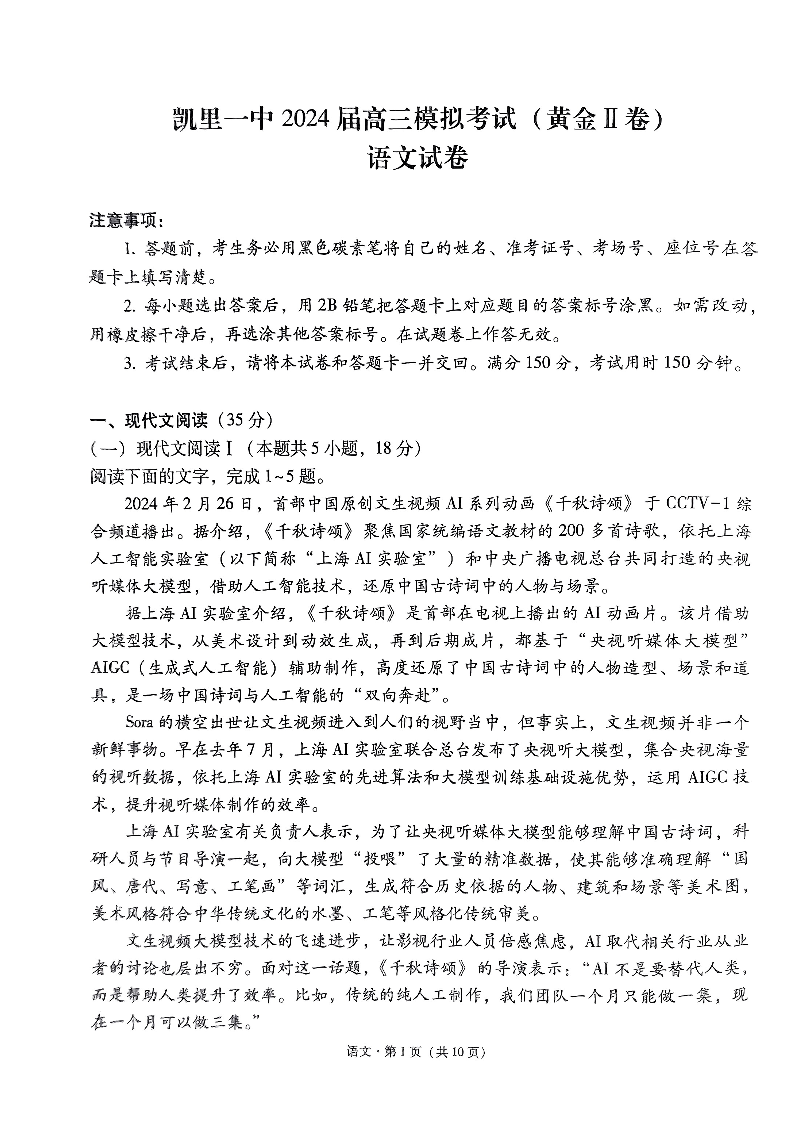 贵州省凯里市第一中学2024届高三三模(黄金二卷)语文
