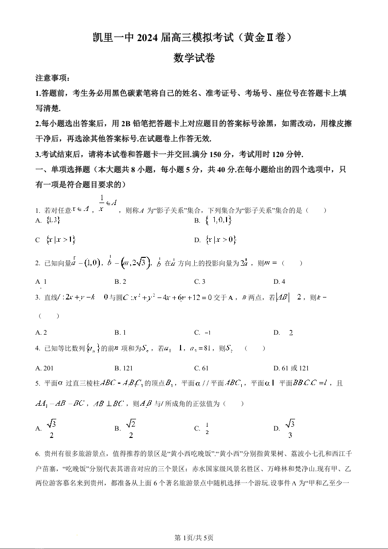 贵州省凯里市第一中学2024届高三三模(黄金二卷)数学(原卷版)