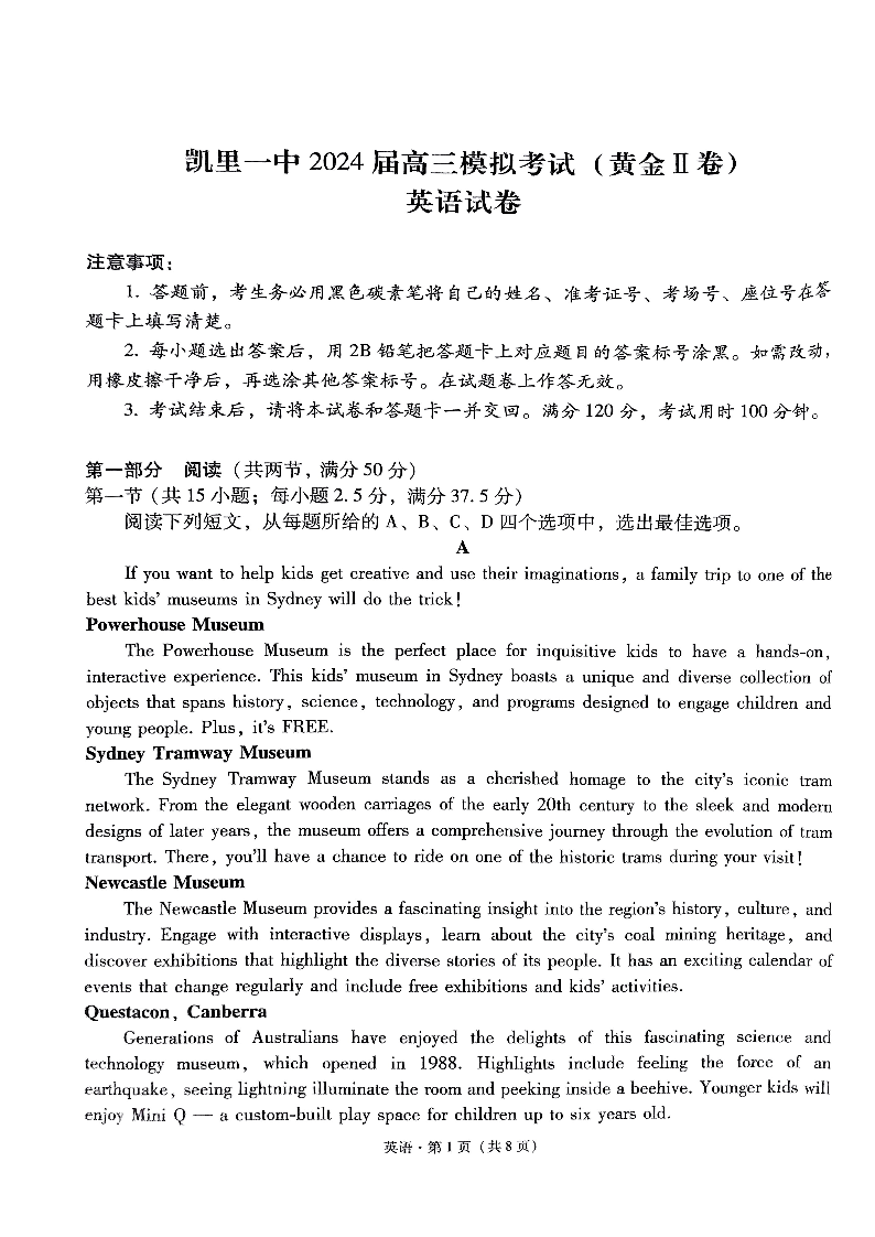 贵州省凯里市第一中学2024届高三三模(黄金二卷)英语