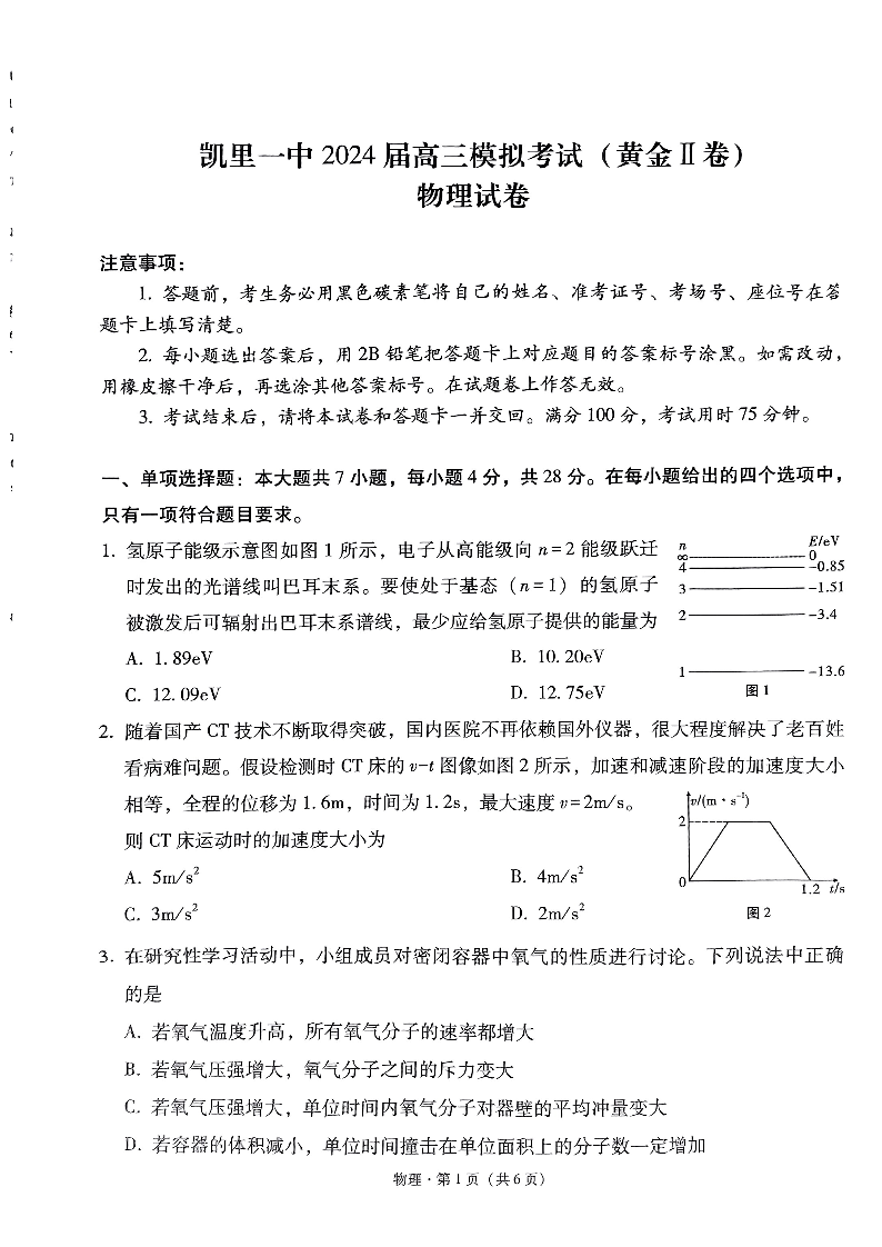 贵州省凯里市第一中学2024届高三三模(黄金二卷)物理