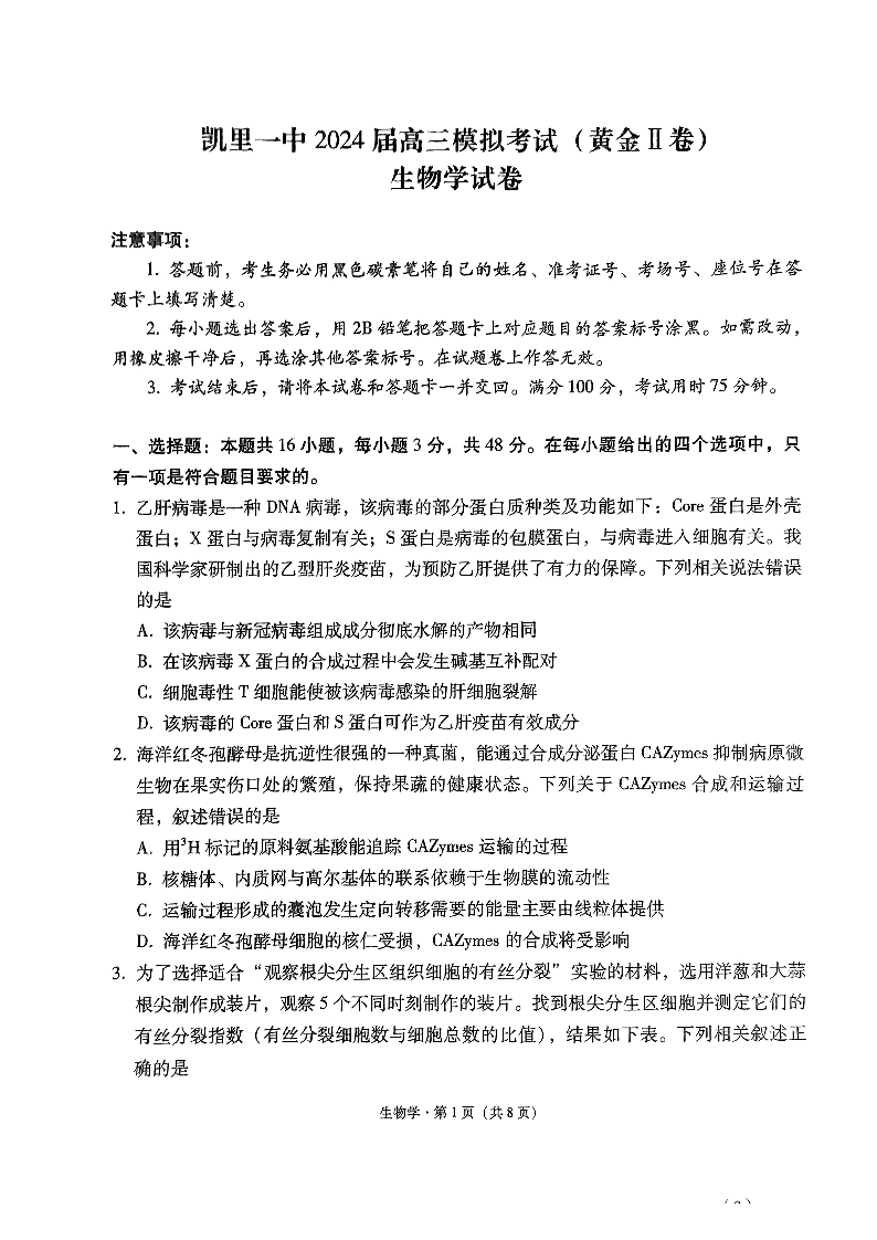 贵州省凯里市第一中学2024届高三三模(黄金二卷)生物