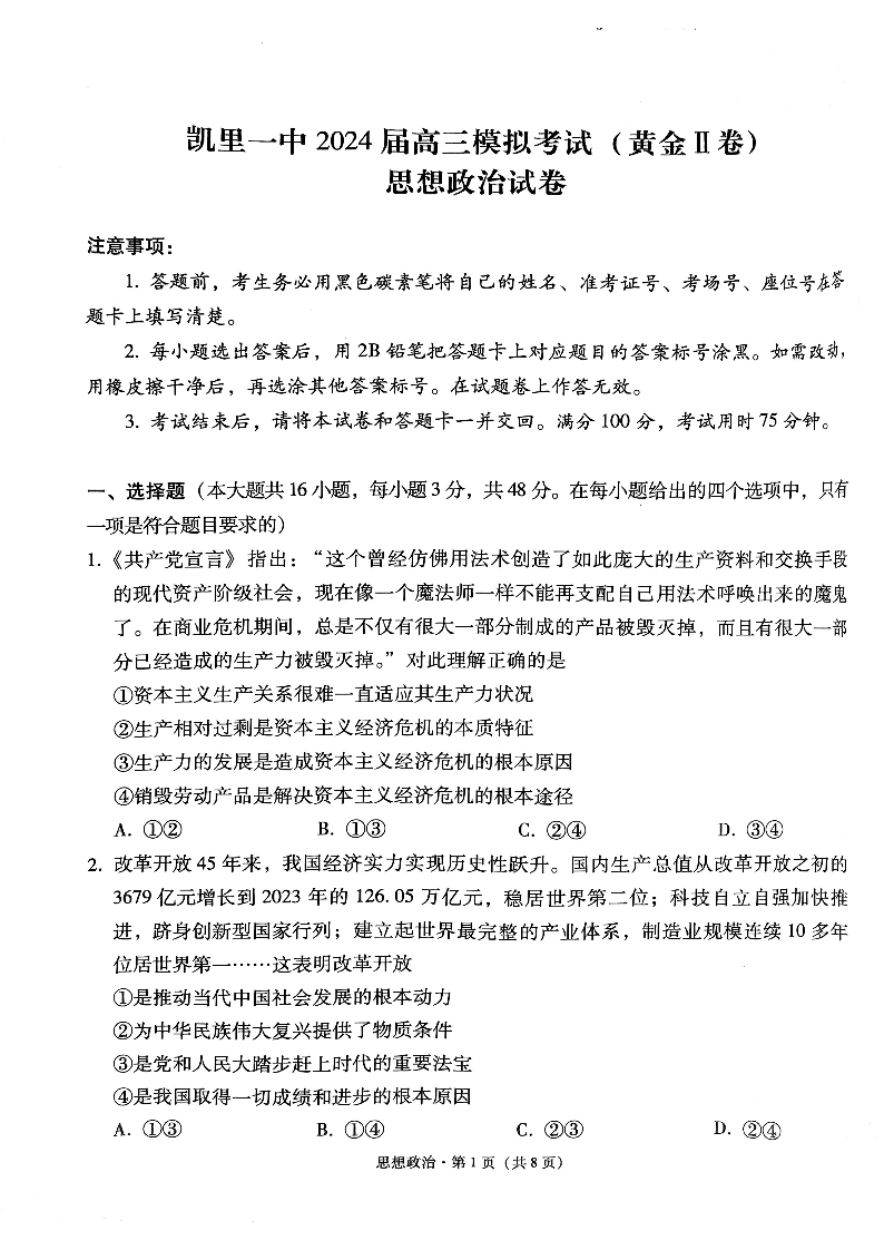 贵州省凯里市第一中学2024届高三三模(黄金二卷)政治