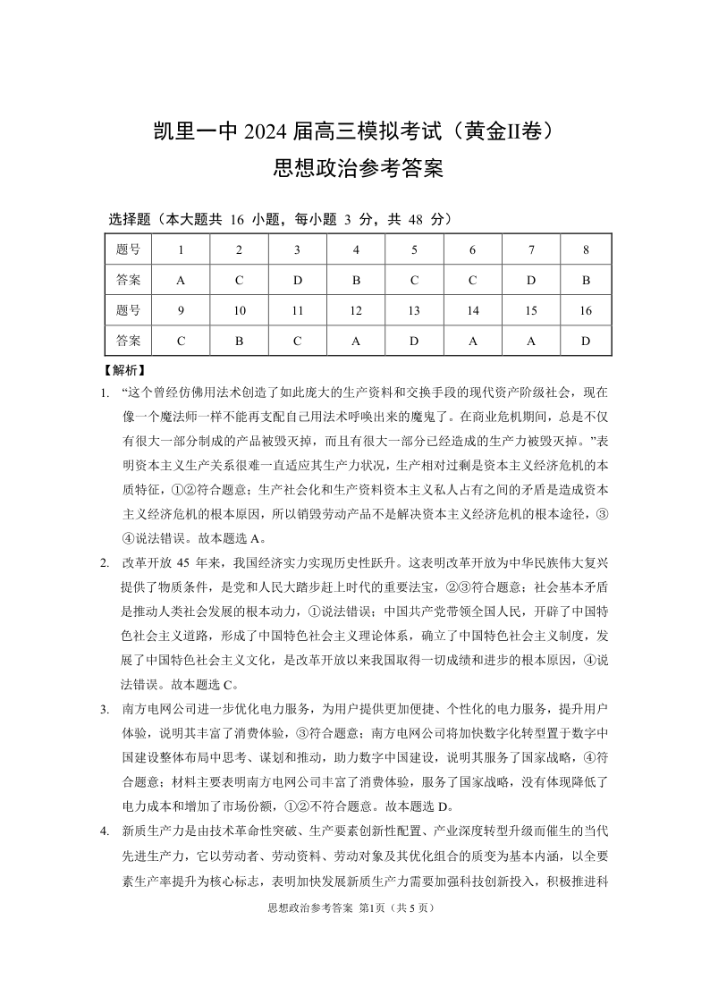 贵州省凯里市第一中学2024届高三三模(黄金二卷)政治答案