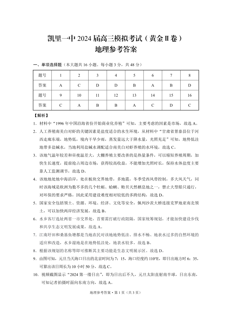 贵州省凯里市第一中学2024届高三三模(黄金二卷)地理答案
