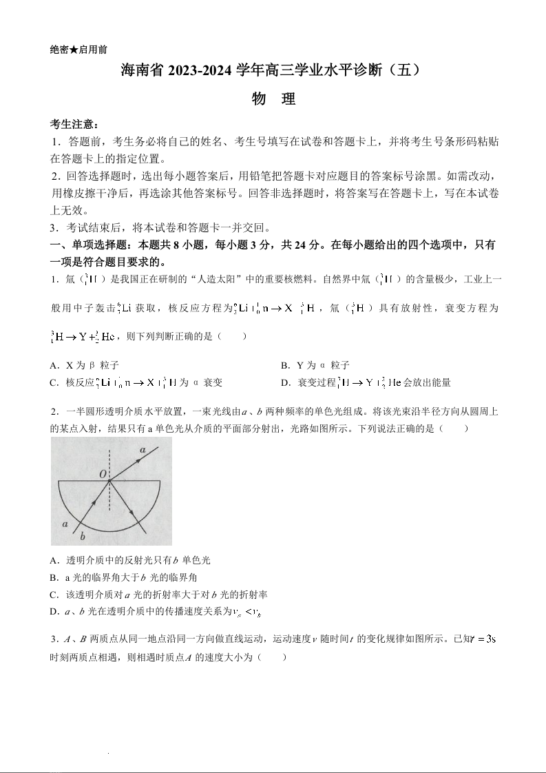 海南省天一联考高三学业水平诊断(五)物理+答案