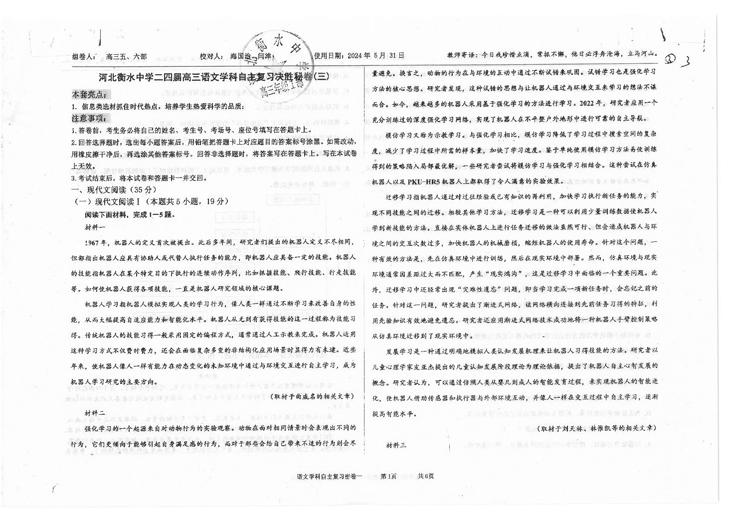 河北省衡水中学2024届高三下学期高考押题密卷(三)语文